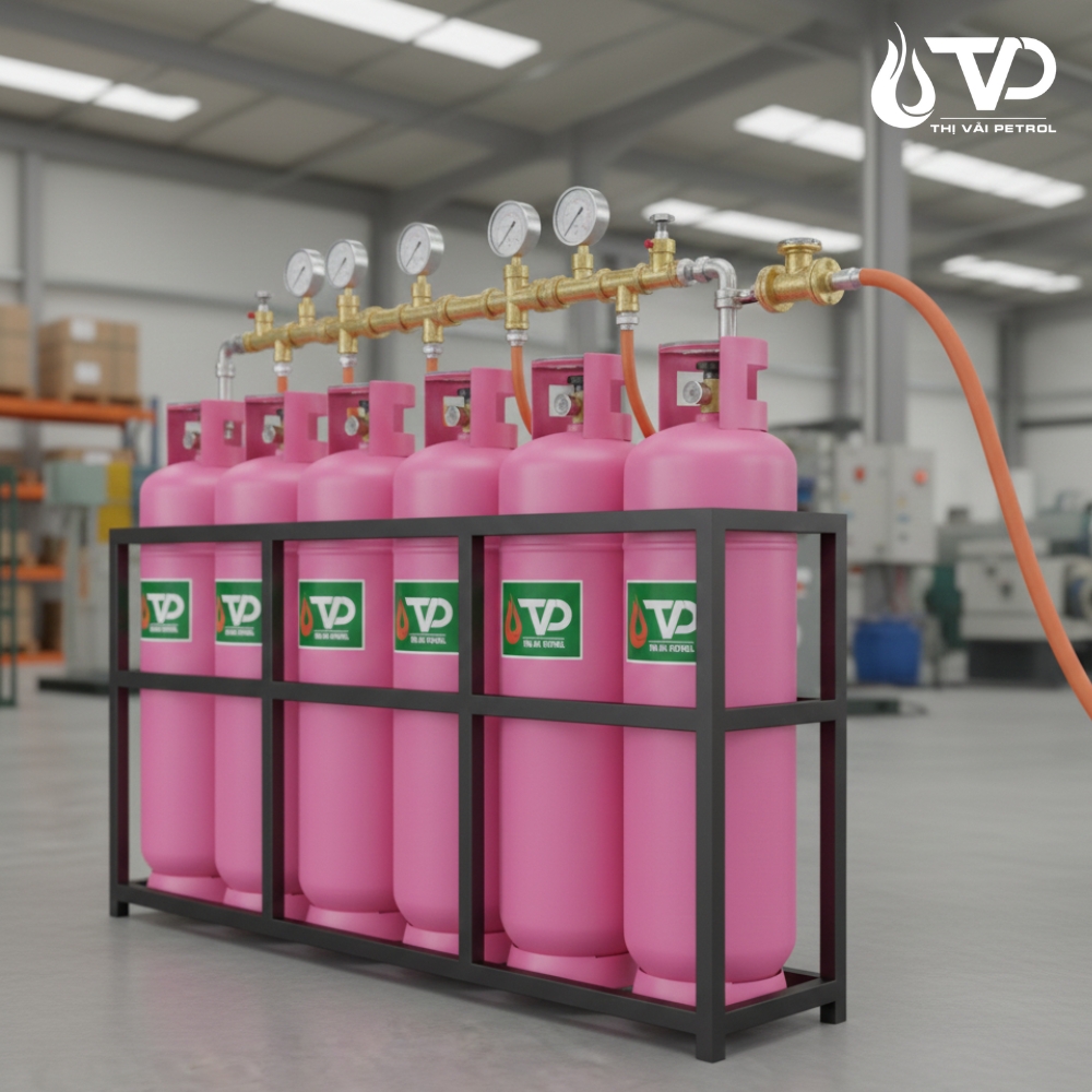 Hệ thống giàn gom 6-10 bình gas công nghiệp 45kg của Thị Vải Petrol là giải pháp cung cấp năng lượng quy mô lớn, được thiết kế chuyên biệt để đáp ứng nhu cầu tiêu thụ nhiên liệu cao mà chưa đủ điều kiện hoặc diện tích để lắp đặt bồn chứa (LPG Tank).
